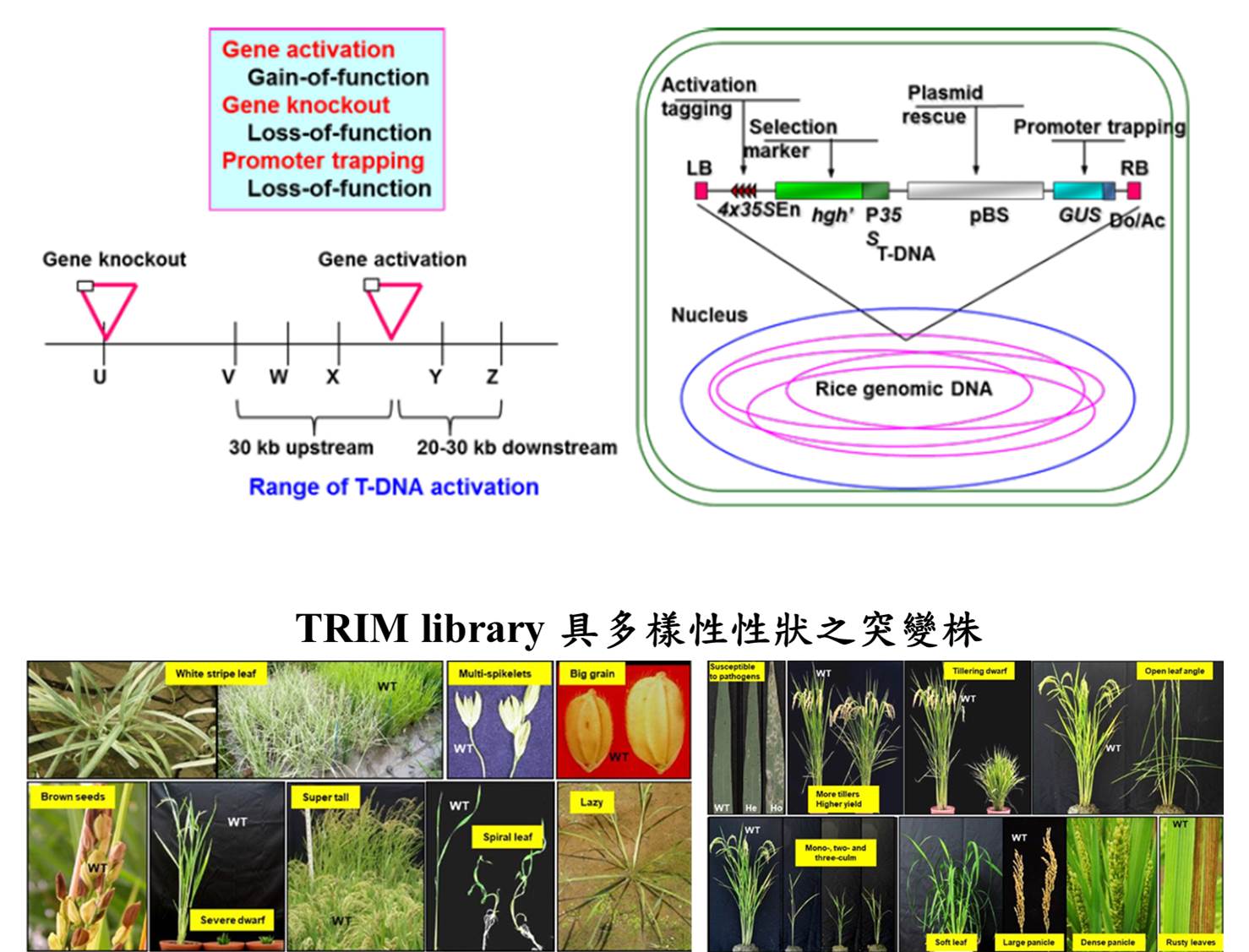 TRIM之T-DNA構築具有追蹤標籤、啟動子捕捉及強化子,因此,可利用正向及反向遺傳(forward reverse genetics)方法研究穀類基因的功能。
